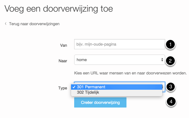 7. Selecteer het type doorverwijzing. Kies voor 301 Permanent als u bent overgestapt naar de nieuwe webbuilder.