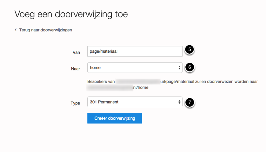Uw domeinnaam is al bekend voor de webbuilder. u hoeft niet een de hele domeinnaam hier in te vullen, alleen de naam van de pagina die betrekking heeft op de doorverwijzing is voldoende.