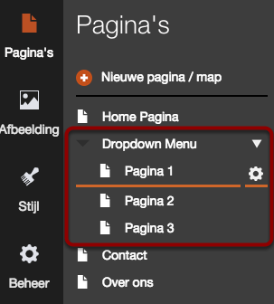 Om een dropdown menu te kunnen maken dient u eerst een map aan te maken. Vervolgens kan u bestaande of nieuwe pagina's aan de map toevoegen. Op de website verschijnen ze vervolgens als een uitklapbaar menu. Zie ook het voorbeeld onderaan deze handleiding.