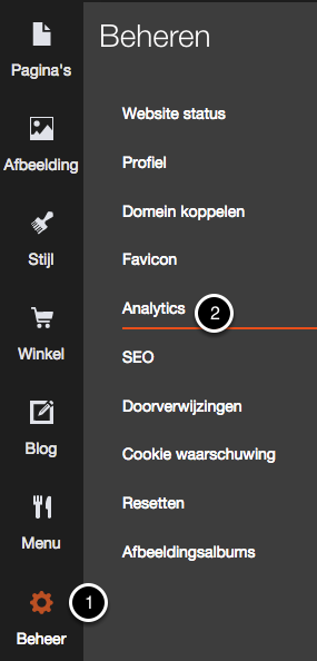 Ga naar Beheer (1) in het linker paneel en klik op Analytics (2).