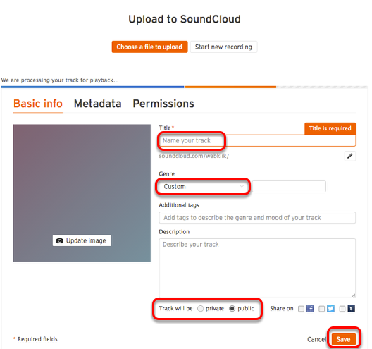 Geef een titel voor uw bestand op. Vul eventueel ook de andere velden in. Om u bestand voor anderen zichtbaar te maken klikt u op 'Track will be open' om deze te kunnen delen. Klik tot slot op 'save' om dit op te slaan.