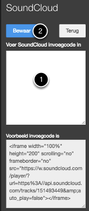 Voeg de embed code van uw soundcloud bestand toe door deze in het lege veld in te voegen (1), klik daarna op bewaar (2).