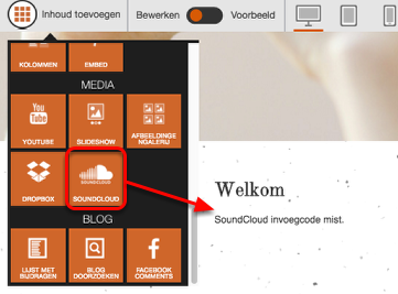 Ga naar uw website en voeg de widget 'soundcloud' toe door deze naar de gewenste plek op de pagina te slepen.