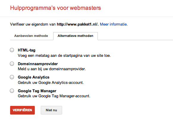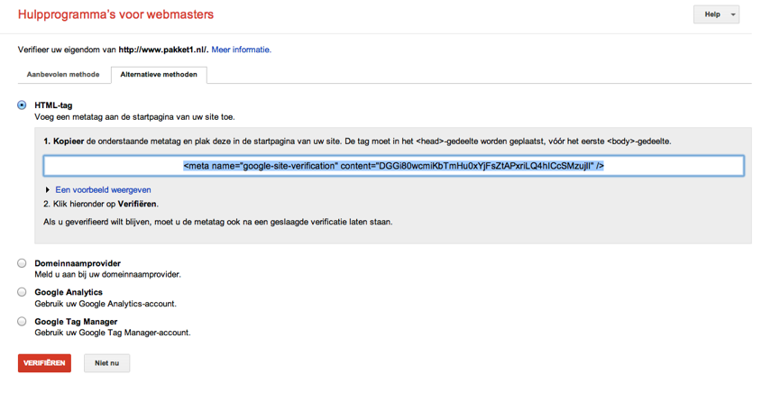 Om uw website bij Google Webmaster te laten verifiëren volgt u de volgende stappen: