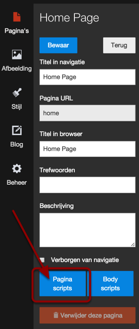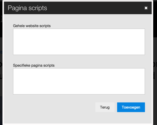 Voeg de HTML-tag toe in het veld 'Gehele website scripts', klik op de knop