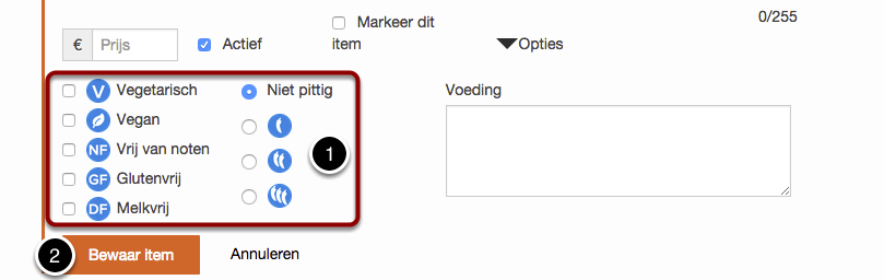 Indien u graag kenbaar wilt maken of een gerecht bijvoorbeeld vegetarisch is, gluten bevat of pittig is kan dit eenvoudig in het menu worden toegevoegd.