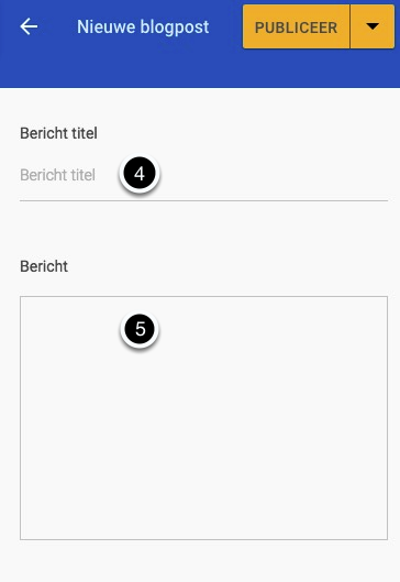 Om de titel en de tekst van het blog bericht in te vullen klikt u op de balk en het veld onder de kopjes. Zie 4 en 5.