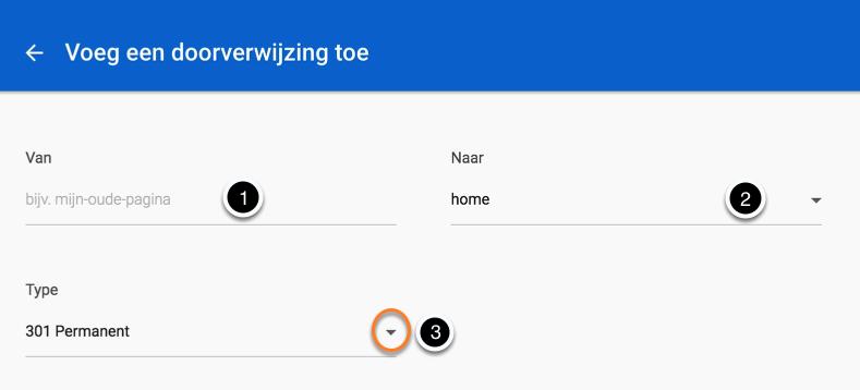 Uw domeinnaam is al bekend voor de webbuilder. U hoeft niet een de hele domeinnaam hier in te vullen, alleen de naam van de pagina die betrekking heeft op de doorverwijzing is voldoende.