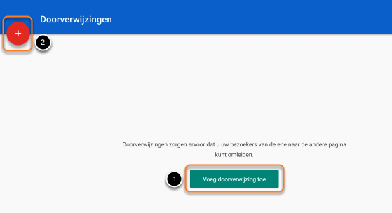4. Klik op ' voeg doorverwijzing toe' (1) of klik op de rode + knop (2)