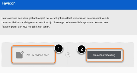 Sleep (1) of kies de afbeelding (2) voor uw favicon. Na het toevoegen ziet u een voorbeeld van uw favicon.