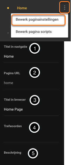 Pagina instellingen zijn te vinden via Site> Website editor > Pagina Opties (klik op de drie grijze puntjes achter de pagina.