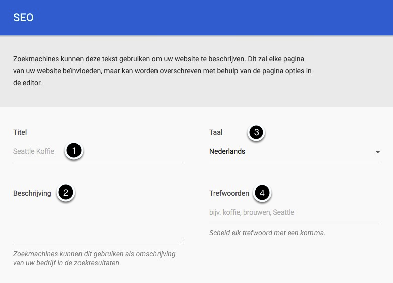 De titel, beschrijving en trefwoorden die u bij de SEO instellingen in de webbuilder invult, helpen om uw website door google te laten indexeren
