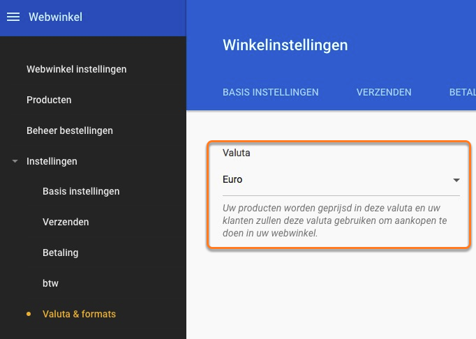 Ga naar webwinkel > Instellingen > Valuta & formats > kies Valuta.