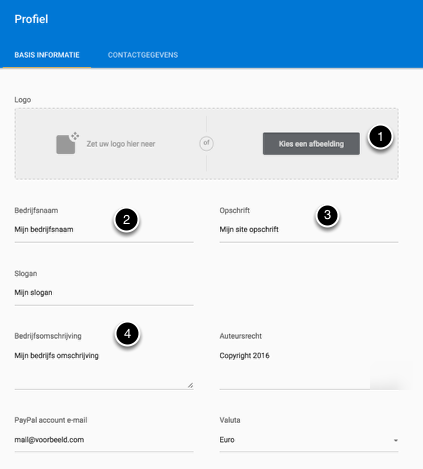 - Kies een afbeelding of logo voor uw website. Deze zal worden getoond in de header, footer en op iedere andere locatie waar een logo nodig is.