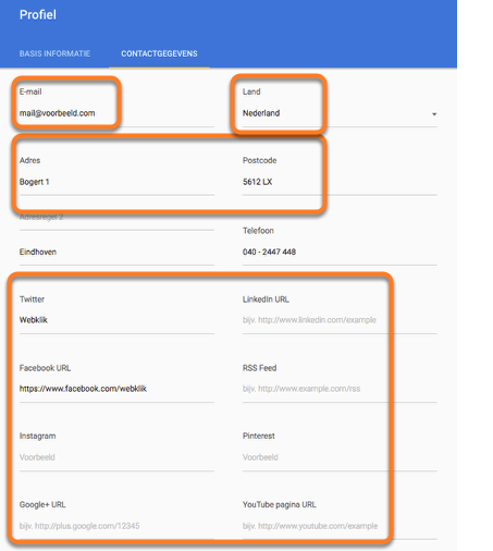 - Wanneer u hier de adresgegevens invult zal dit automatisch het adres of locatie kaart op de website aanpassen. Let op: u dient dan wel een locatie kaart (map) op uw website geplaatst te hebben, via Inhoud toevoegen.
