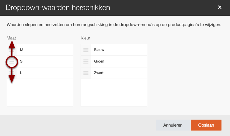 Klik en versleep de waarde naar boven of beneden op deze te herschikken. De bovenste waarde zal als standaard waarde worden getoond als de klant een enkel product bekijkt.